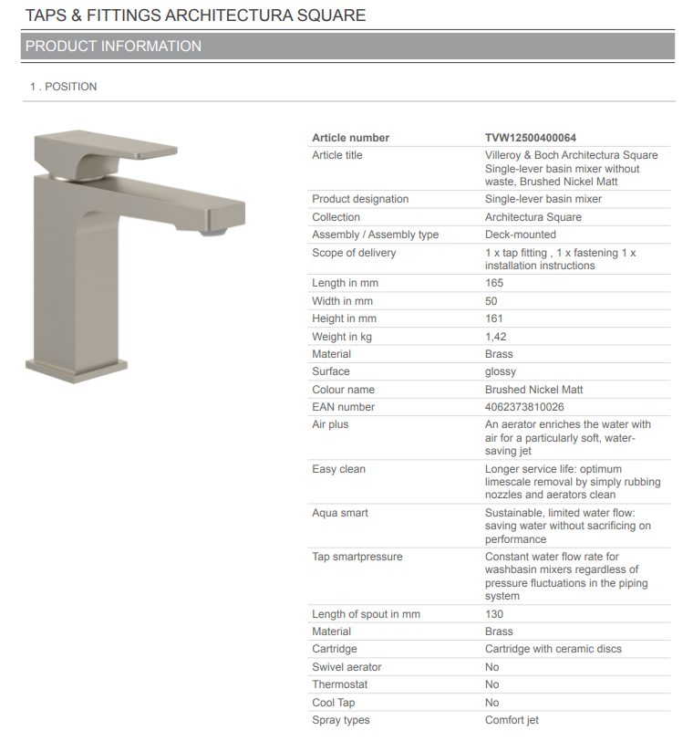 Baterie lavoar V&B – Architectura Square