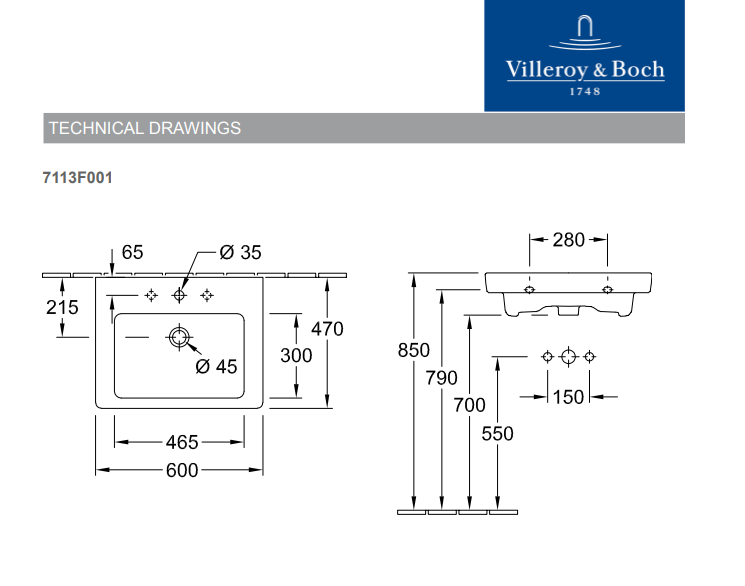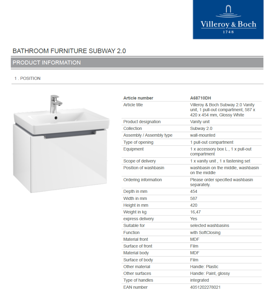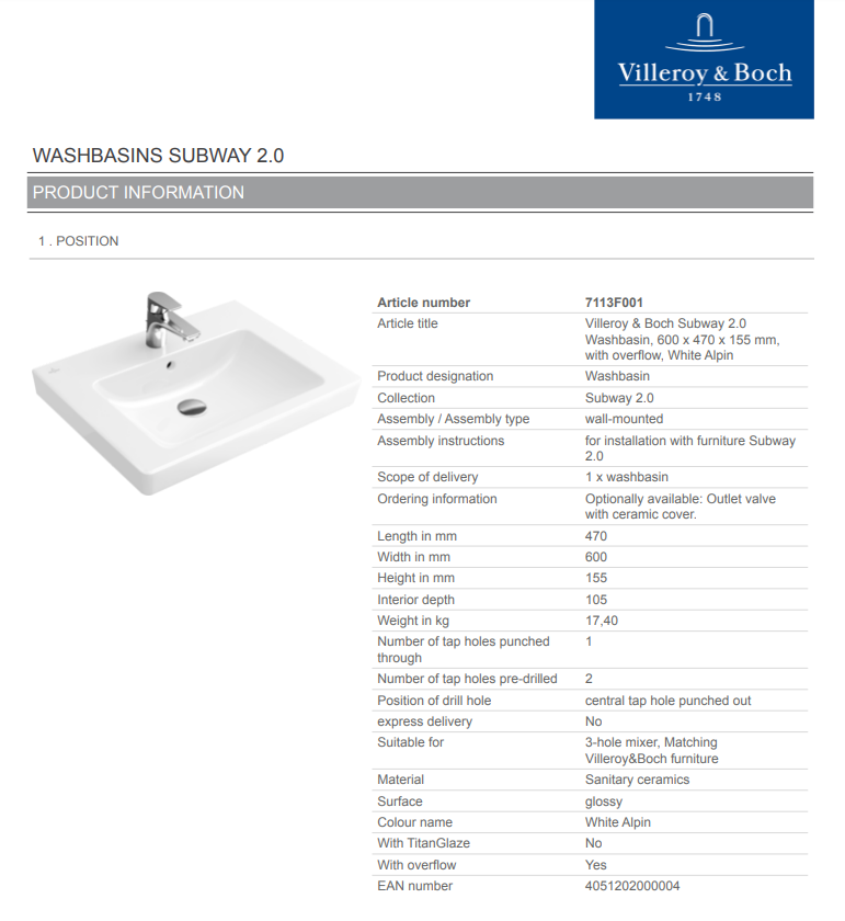Incl. lavoar Subway 2.0, L=600 mm, A=470 mm cod: 7113F001